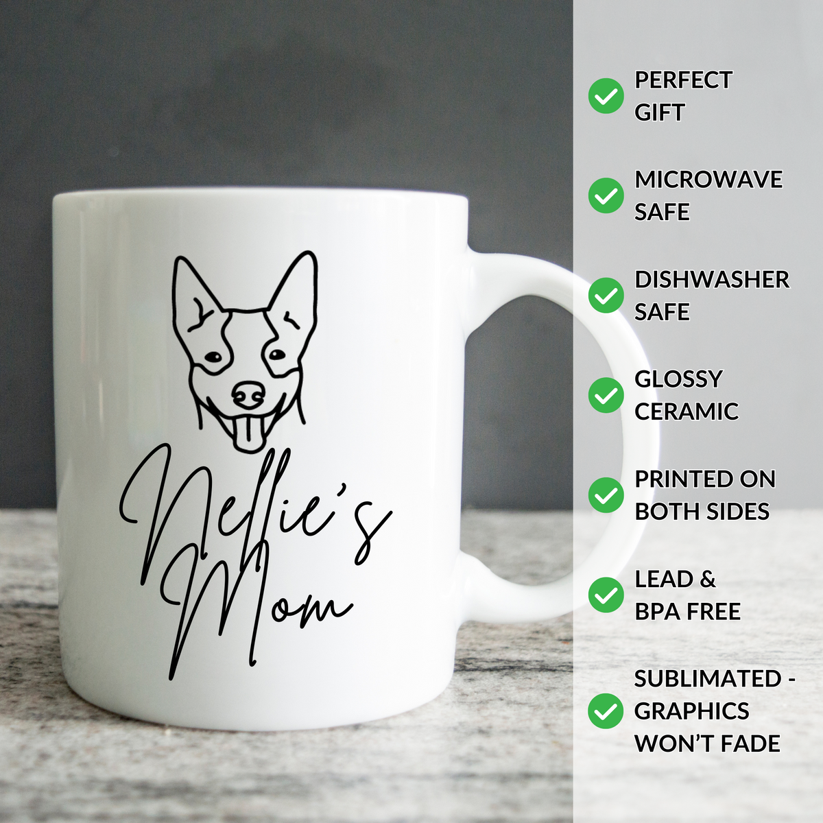 You can customize this mug by selecting the breed and the writing. For example, Whiskey's Mom, Koa's Aunt, Ryuk's Dad, etc